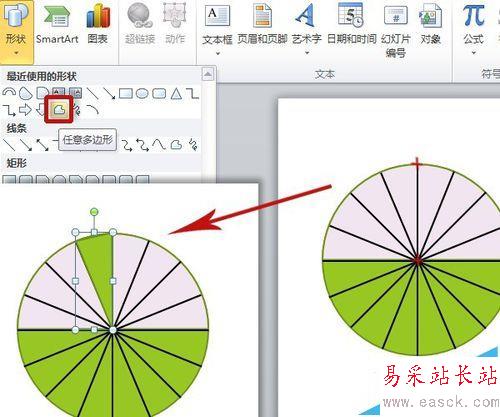 8、形狀工具中選擇“任意多邊形”,從圖中上方的小十字開始向下畫出與十六分之一圓等大的三角。