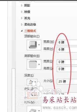 7、選擇“三維格式”的“頂部棱臺”效果,參數設置和效果如下: