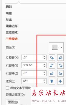 6、現在來給它設置立體效果,先選擇“三維旋轉”,參數如下: