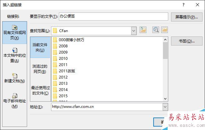 在打開的對話框中,鏈接可以選擇現有文件或網頁,也可以選擇當前PPT中的其他幻燈片,還可以鏈接本機上的文件,電子郵件等。本例選擇鏈接到“辦公便簽”的主網站http://www.cfan.com.cn,將此網址填入地址欄中,點擊“確定”就可以啦。