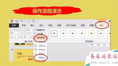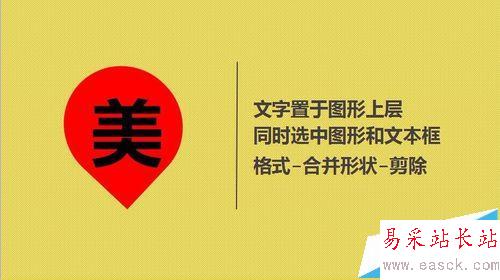 3、文字置于圖形上層,同時選中圖形和文本框,格式-合并形狀-剪除
