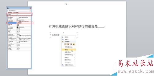 4、在選項按鈕控件上單擊鼠標右鍵,點擊“屬性”。在屬性面板中,修改選項按鈕的名稱為“a”,caption為“匯編語言”。