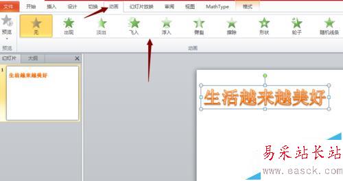 2、然后選中文字的文本框,點擊菜單里的動畫,這時我們可以看到很多已經設置好的動畫,比如淡出、飛入等等動畫