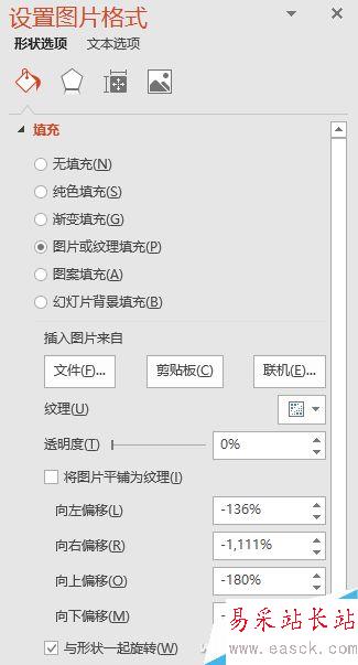 右擊繪制的形狀,從彈出的右鍵菜單中點擊“設置形狀格式”,然在右側打開設置圖片格式窗格,單擊展開“填充”項,選中其下的“圖片或紋理填充”,在下方插入圖片來源中點擊“文件”按鈕,再次選中填充準備做局部放大處理的那張原圖。