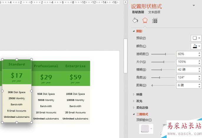 位置擺好之后,右擊這個分離的表格,選擇“設置形狀格式”,再在右側打開的窗格中,為它設置陰影效果就可以啦。