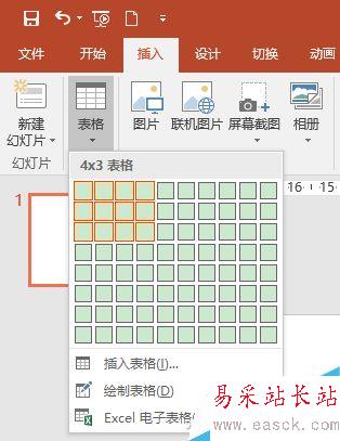 在PowerPoint 2016中,切換到“插入”選項卡,點擊“表格”,再從彈出對話框中設置幾行幾列,即可得到一個默認為藍色漸變的表格。