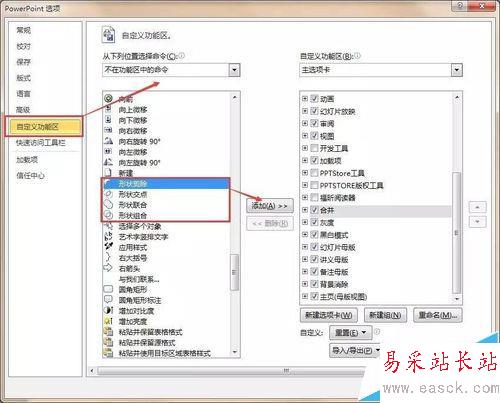 7、2010版的ppt,形狀剪除要在文件——選項——自定義功能區(qū),然后添加到新建文件夾——新建組里面,剪除完畢的效果都是一樣的,說到這里,鏤空設(shè)計效果就講完了,頁面的其他排版大家自行調(diào)整哦!