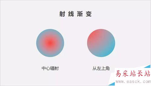 方法二:射線漸變:不同于線性漸變,是集中一點分散開來的漸變方式,射線漸變目前有5種方式,平時應用的幾率還是比較高的,大家可以多多嘗試聯系一下,效果如下圖;
