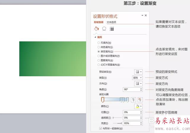 這里需要注意的是,我們需要熟練掌握第一、二中漸變方式,也就是線性漸變、射線漸變,日常ppt種使用率最多,尤其是第二種射線漸變大多應用于封面、背景素材;