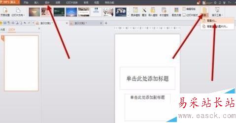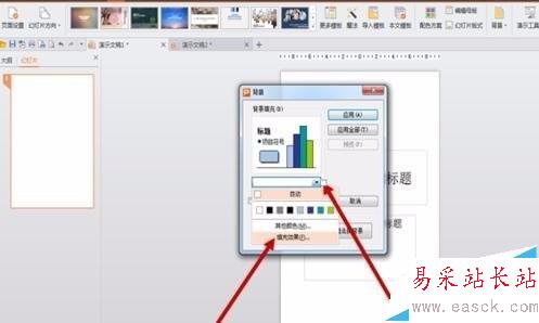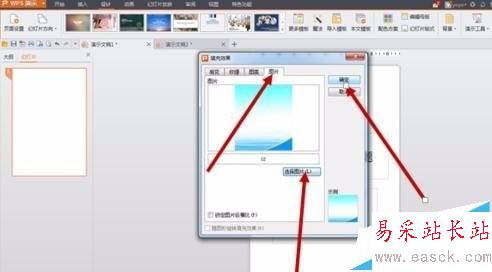 2、在菜單欄“設計”中選擇“背景”,在下拉菜單中選擇“背景...”來打開背景設置界面。點擊“背景填充”的倒三角形,然后選擇“填充效果”,在彈出窗口中點擊“圖片”,然后“選擇圖片”,點擊確定。