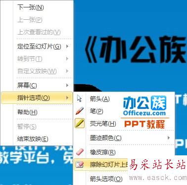 4、但是你如果要恢復到原來的PPT幻燈片,可以在右鍵彈出的菜單中選擇“指針選項”中的“擦除幻燈片上的所有墨跡”命令。做的這些標記不會修改幻燈片本身的內容。