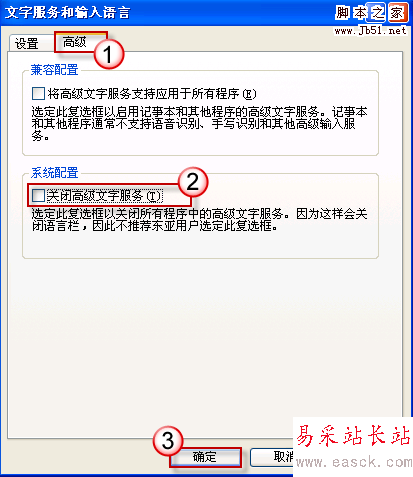 進入“文字服務和輸入語言”設置窗口,單擊“高級”選項卡,默認狀態下“關閉高級文字服務”復選框前是沒有勾選的,如果有,請將其清除。然后退出設置窗口。