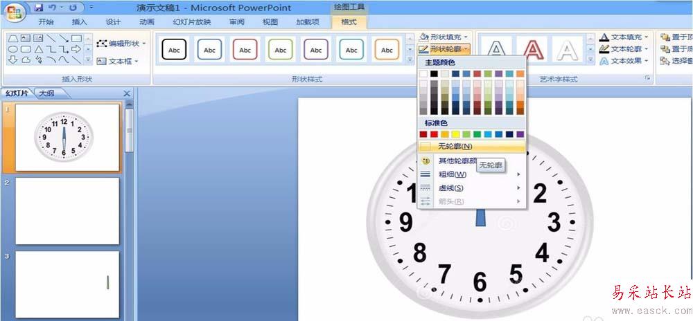 6、然后把旋轉(zhuǎn)好的時針移到原來時針的尾部連接好。并把它設(shè)置成無填充色和無輪廓,相當(dāng)于透明看不見了。