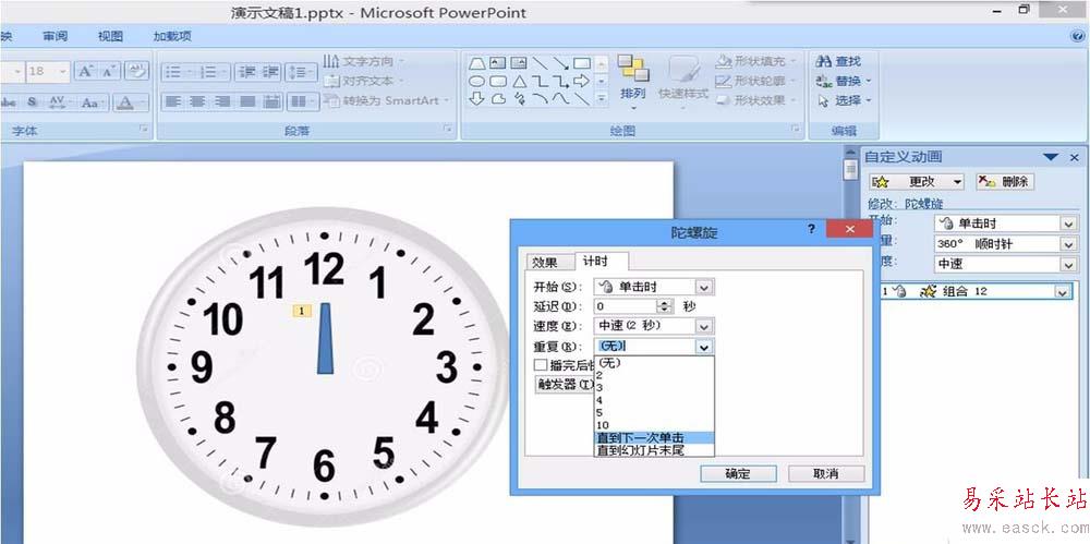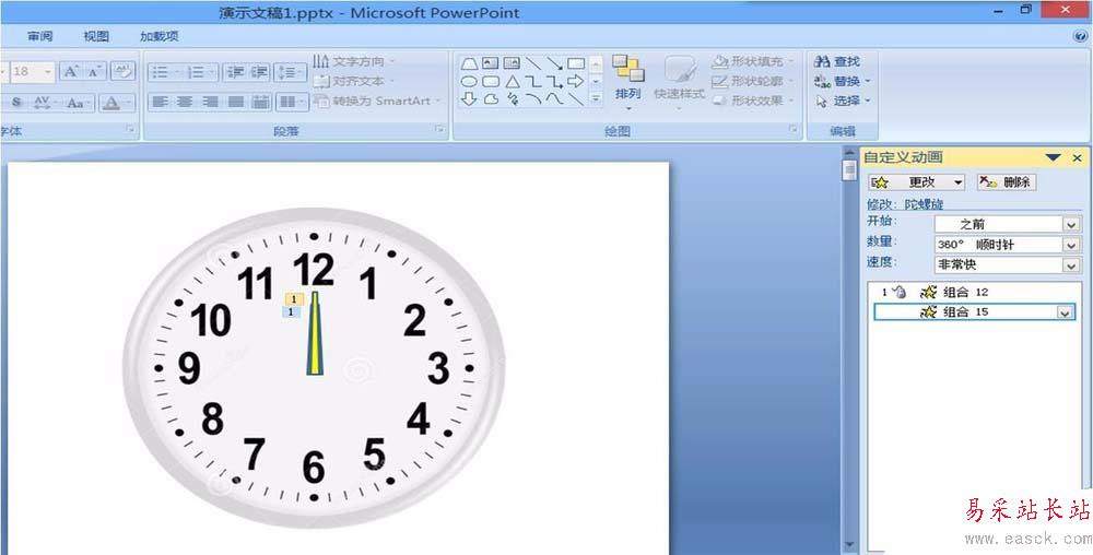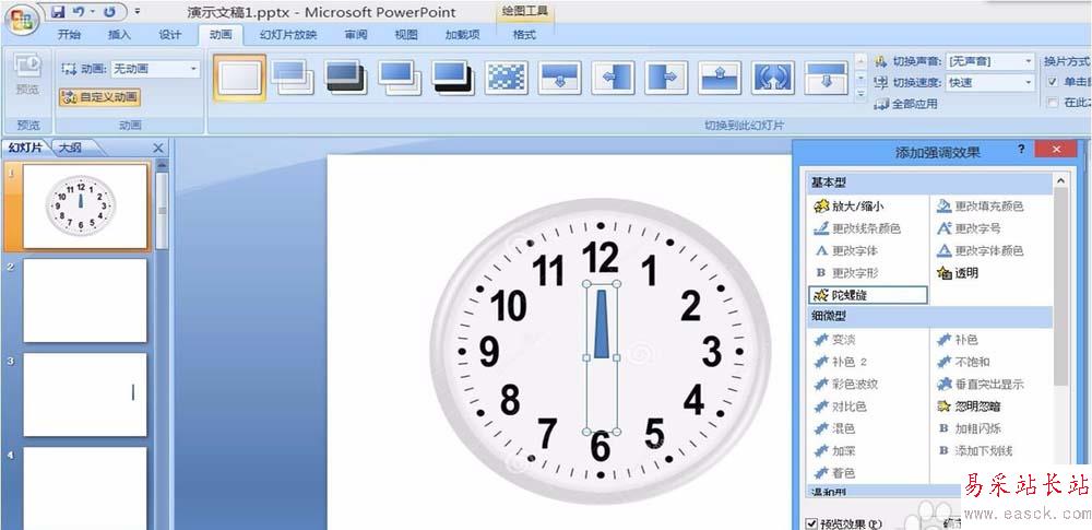 8、把組合好的時針添加動畫效果。在動畫—自定義動畫—強調(diào)—陀螺旋。