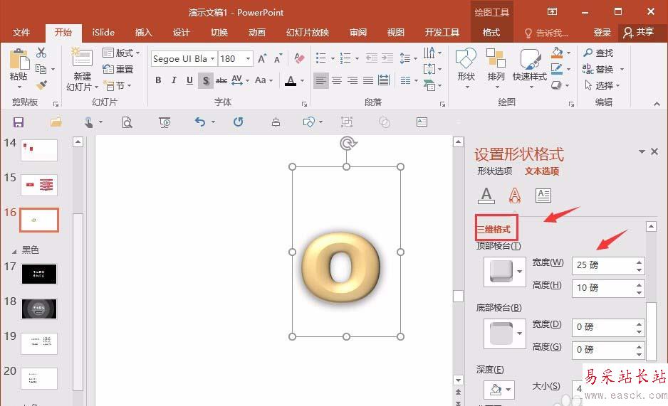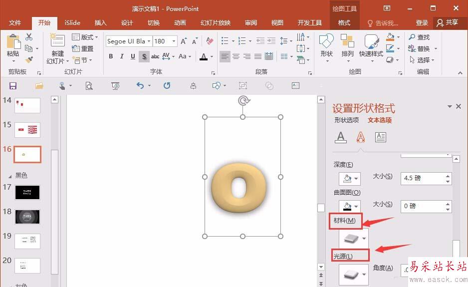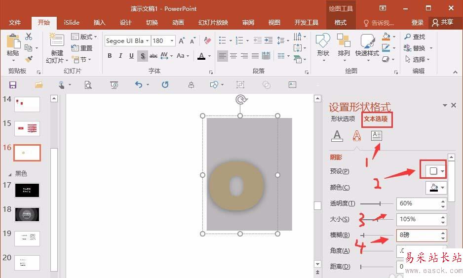 2、選擇文本,然后設置一個格式——里面選擇文本選項——設置居中陰影,大小105%,模糊為8磅(可以根據自己需求來進行調整)。