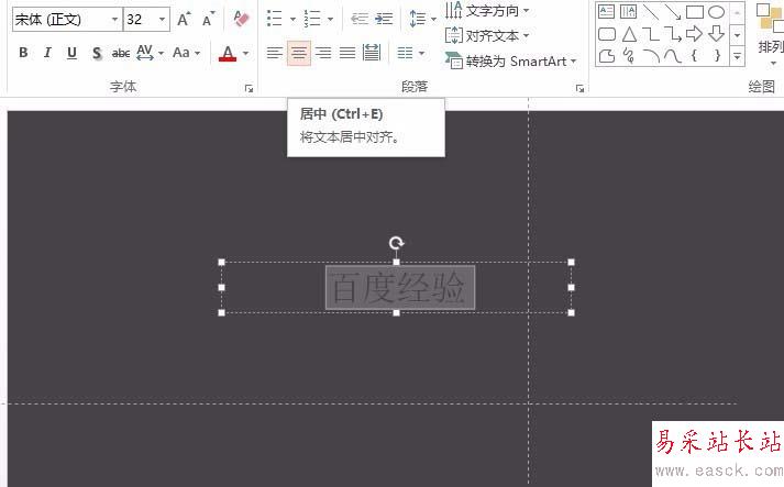 2、選中文字后,開始菜單-讓其居中對齊,并給字體設置一個合適的襯線字體。(下面將給字體設置為白色)