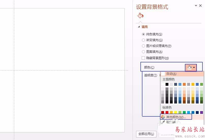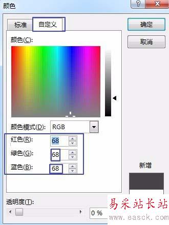 2、選擇純色填充-單擊顏色下拉菜單-選擇其他顏色,在彈出的對話框中單擊進入自定義標簽卡,選擇RGB顏色模式 - 在紅、綠、藍中都輸入68。(即RGB值)