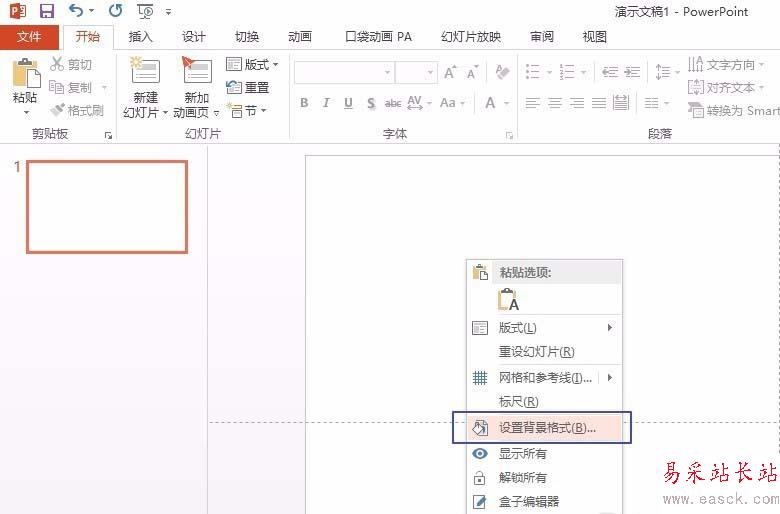1、打開PPT,將PPT版式設為空白。此時在PPT空白頁,右鍵菜單_單擊-設置背景格式。