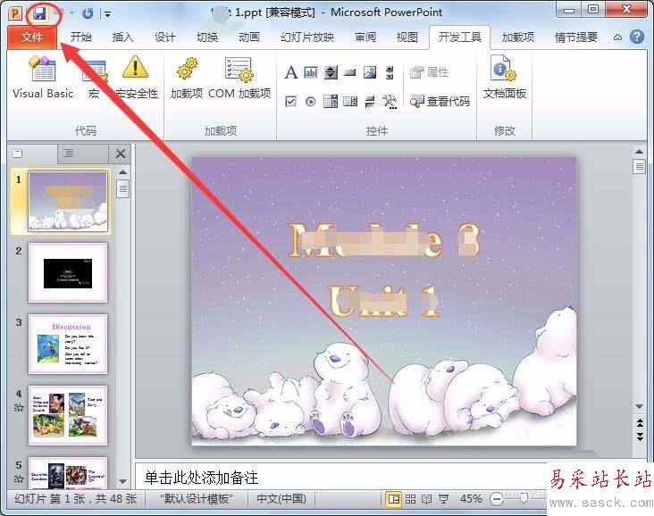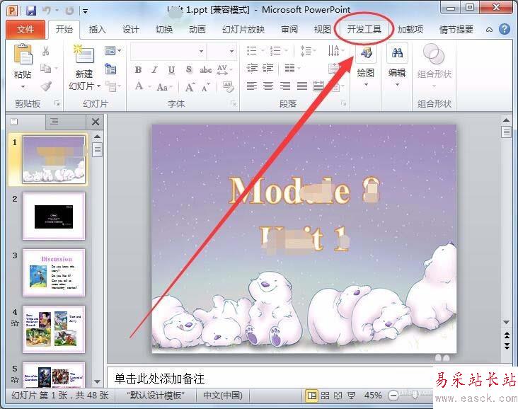 2、打開一個帶有控件的PPT,選擇開發工具選項卡。