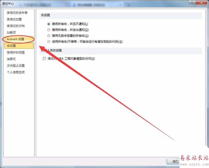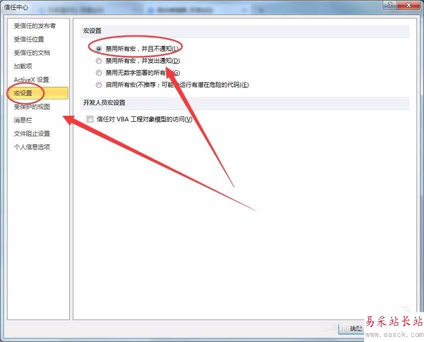 4、信任中心對話框中,選擇宏設置選項卡,選擇禁用所有宏并且不通知選項。