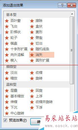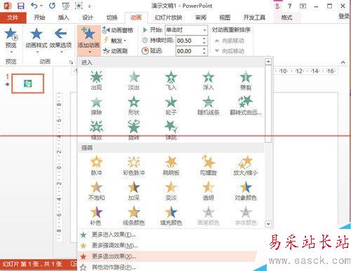 5、現在添加第二個消失的動畫效果。點擊“添加動畫”,點擊下面的“更多退出效果”。