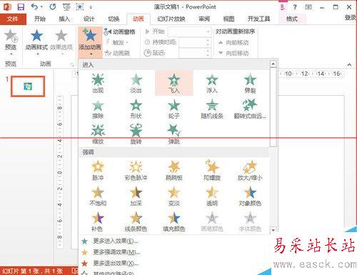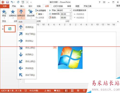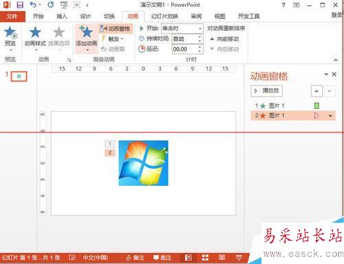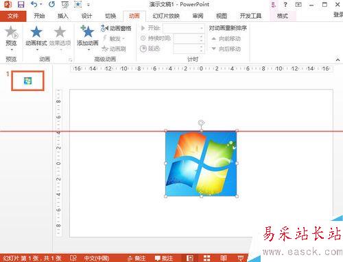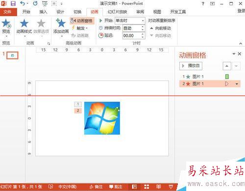 PPT2013 為一張圖片設置先后不同的動畫效果。這里以一張圖片,先飛入再消失為例。