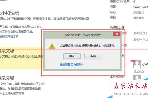 5、此時,會彈出對話框,提示該文檔將先被標記為最終版本,然后保存。單擊“確定”即可完成設(shè)置。