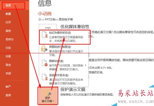 4、單擊“保護演示文稿”圖標后會出現(xiàn)一些選項,選擇“標記為最終狀態(tài)”