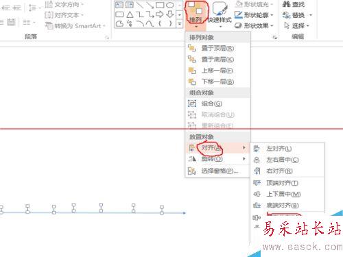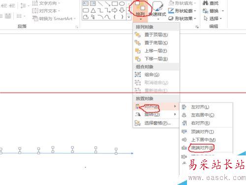 7、繼續選擇所有的刻度線,然后選擇上方的<排列>-<對齊>,然后先選擇橫向分布,如下圖,這下X軸就完成了,在刻度下輸入合適的文字即可。
