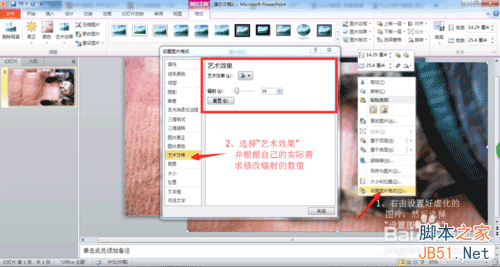 右擊之前設置好虛化的圖片,選擇“設置圖片格式”,然后在“藝術效果”中根據自己的實際需求進行數值的修改。
