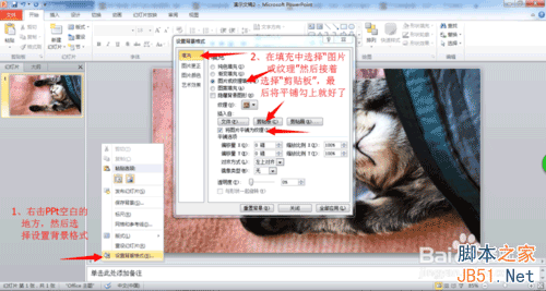 右擊PPT空白的部分,選擇“設置背景格式”。接著在填充中依次選擇“圖片或紋理”→“剪貼板”→“將圖片平鋪為紋理”。