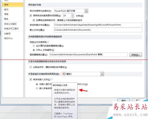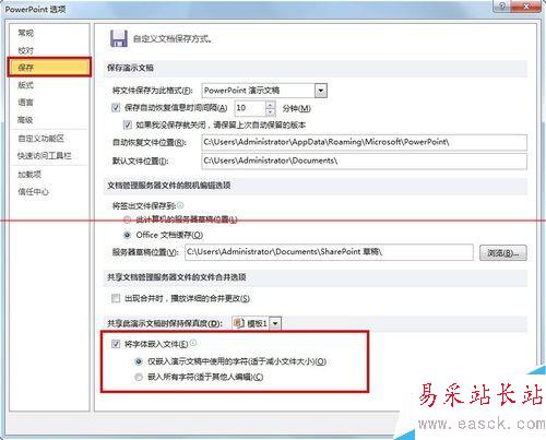 3、【選項】窗口中,左側找到【保存】,點擊該項,右側窗口最下面一個可選功能是“將字體嵌入文件”,勾選前面的復選框。