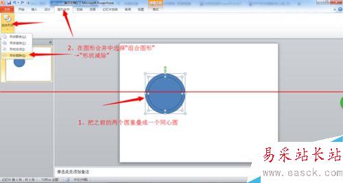 4、將兩個圖形重疊在一起,畫一個相同大小的圓形,然后再次使用“形狀減除”功能,將圓環(huán)剪出來。
