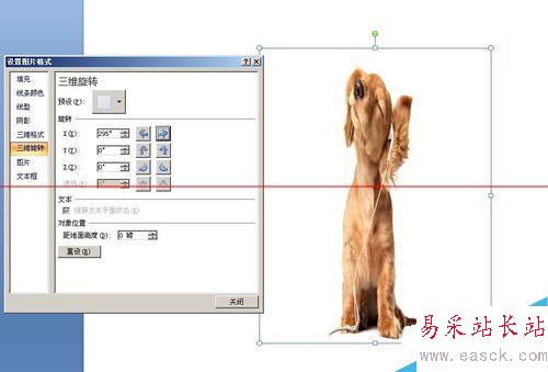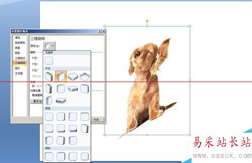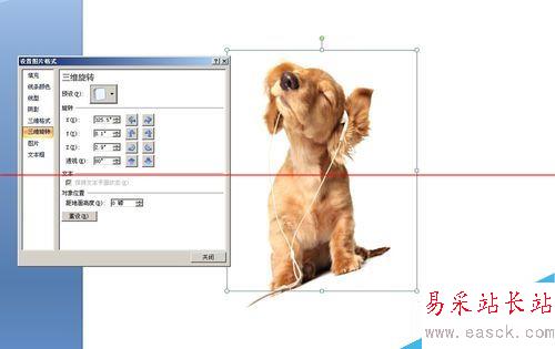 4、在“設置圖片格式”中,選擇“三維旋轉”。里面可以進行角度控制的旋轉。