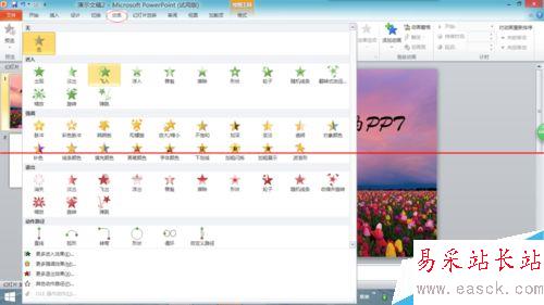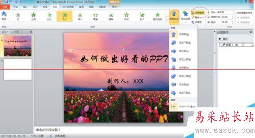 5、點擊菜單欄里“動畫”一欄,設置幻燈片的動畫,讓你的PPT更具有生動性。“效果選項”可以設置動畫的方向,“動畫窗格”可以對你的動畫進一步設置。你運用動畫對幻燈片里的文字,圖片進行設置,讓你的幻燈片活起來。
