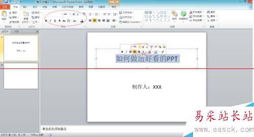 3、輸入你想要的內容,對文字內容進行字體,字號以及顏色的設置,讓文字內容顯得更加豐富,當對標題進行設置時,副標題文字的大小不要超過主標題文字的大小。