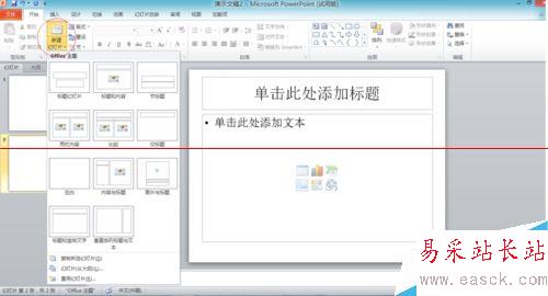 2、新建幻燈片:根據你所要設計的內容,選擇相應的版式,新建幻燈片。