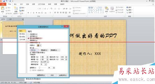 4、設置幻燈片的背景,讓你的PPT更具有吸引力,根據你的需求,可以選擇純色填充或漸變填充或圖片紋理填充或圖案填充,這里我選擇的是用文件夾里的圖片填充,需要注意選擇合適的背景,你的背景不要使你的文字內容變得模糊不清。