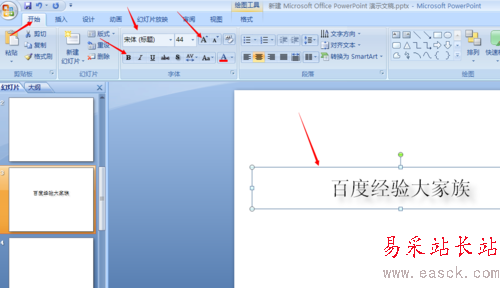 7、我們同樣選中文字,點擊最上面“插入”左邊的“開始”按鍵,如圖箭頭所指的地方將文字加黑,加大,更換想要的主題字體;