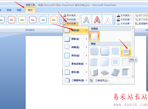 5、點擊完“格式”這個按鍵后,點擊格式下面的形狀效果,再點擊形狀效果下面的預設,下面有不同形狀的預設,我們就選擇一個預設4吧!這個可以根據自己想要的效果隨便選擇;