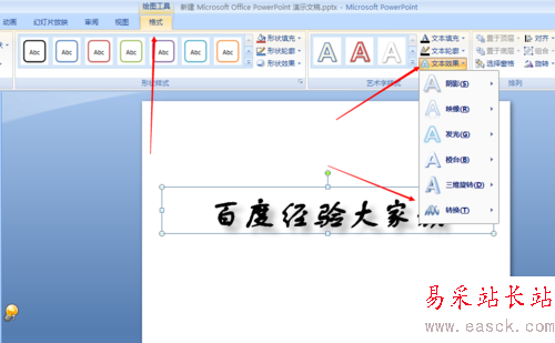 9、我們再選中文字,點擊“視圖”旁邊的“格式”按鍵,再點擊格式下面的“文本效果”,繼續點擊“文本效果”下面的“轉換”;