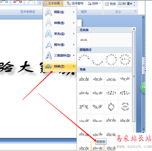 10、點擊完“轉換”之后會出現“跟隨路徑”、“彎曲”這些效果,我們就可以根據我們想要的效果進行選擇,如圖我想要“朝鮮鼓”這種類型的,我就選擇“朝鮮鼓”;