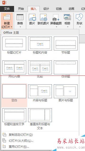 第一個(gè)是新建幻燈片,這個(gè)和開始選項(xiàng)卡中有所重復(fù),不再過多講解,記住插入的時(shí)候最好直接選用自己想用的版式。