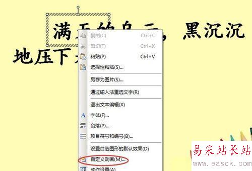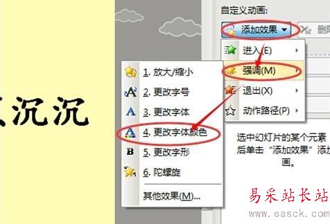 選中要變色的文本框,右擊 選擇自定義動畫,添加效果--強調(diào)--更改字體顏色,然后選擇想變的顏色。