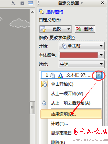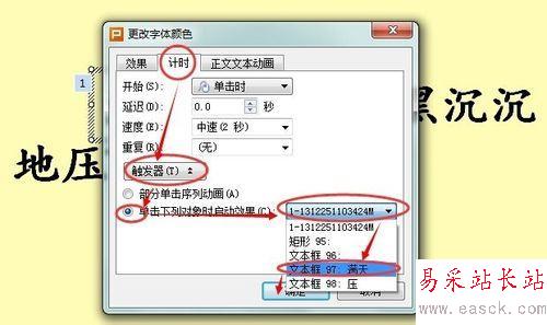 最后最重要的一步,用來實現(xiàn)點哪個哪個變色,就要用到它啦,觸發(fā)器!點擊下拉框的下拉按鈕--效果選項--計時--觸發(fā)器--選中單擊下列對象時啟動效果,然后選擇下就好了。同理,另外一個要變色的字也這要操作就大功告成了!