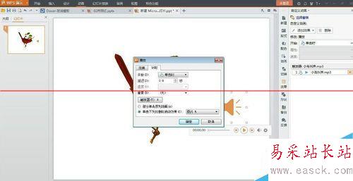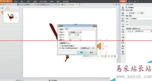 4、選定圖片上的喇叭(小鳥叫聲),動畫--自定義動畫--動畫效果設為播放,在動畫窗格里設置計時,如圖。觸發器--單擊下列對象時啟動效果--選擇小鳥圖片--確定。