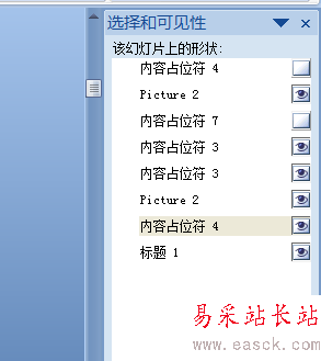 3、點開選擇格窗,就可以發(fā)現(xiàn)右方有個窗口,當(dāng)你不需要設(shè)計某個圖片時就可以點一下該圖片后面的眼睛,這樣這個圖片就會隱藏,你就能輕易地選中、調(diào)整你要設(shè)計動畫的圖片了。
