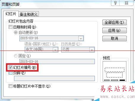 4、切換至“幻燈片”選項卡,勾選“幻燈片編號”的復選框。