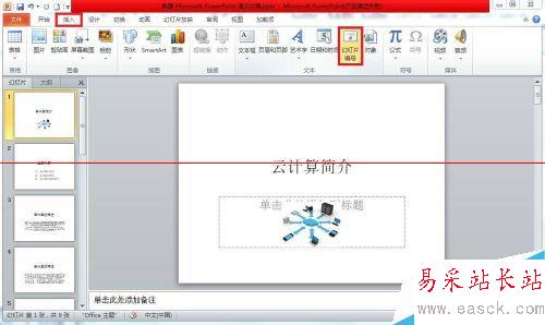 2、單擊“插入”選項卡下“文本”組中的“幻燈片編號”按鈕。