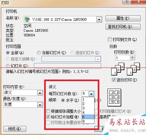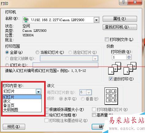 4、在“打印內容“右邊有個“每頁幻燈片數”選項,按你自己要求選擇相應的數字,邊上能看到縮略圖。